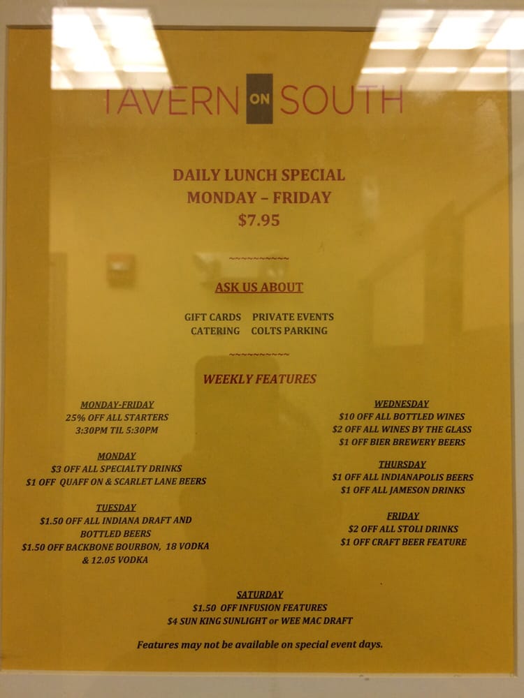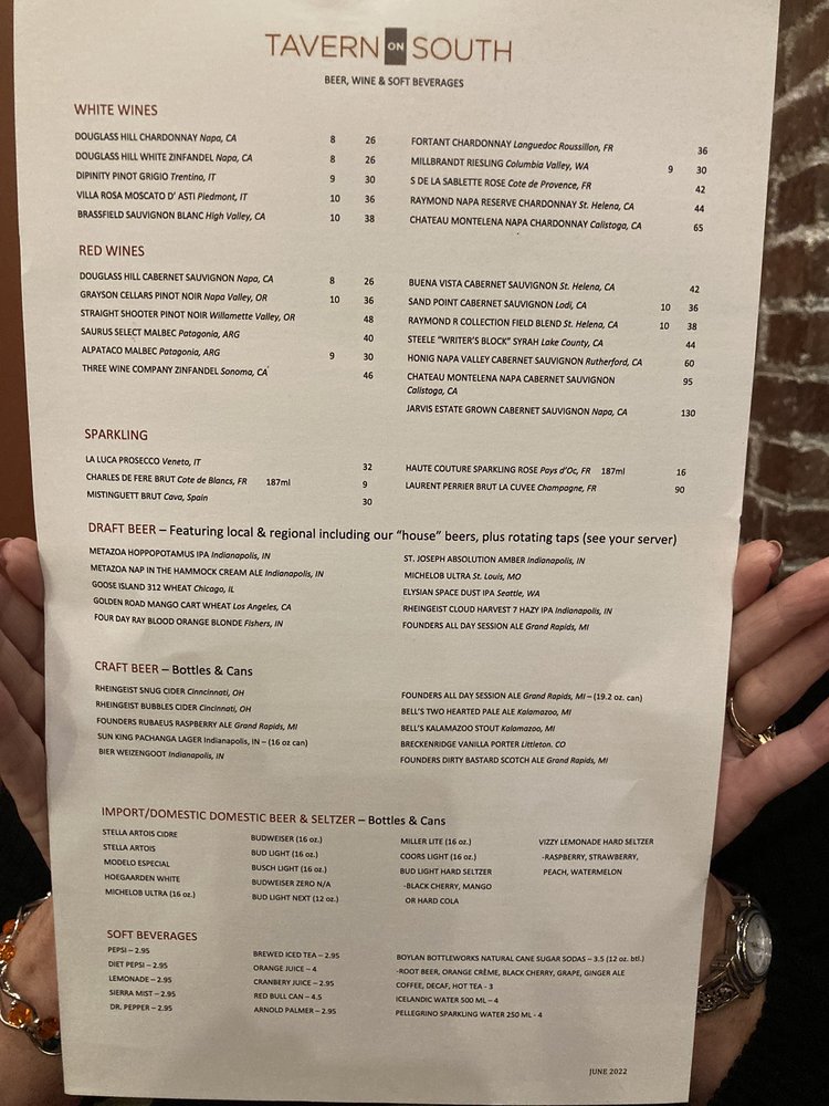 Introducing the menu at Tavern on South, located in Indianapolis, offers a diverse selection of New American cuisine with a focus on bars. With amenities like outdoor seating, wheelchair accessibility, and free Wi-Fi, this establishment caters to a range of preferences. The starters include options like Chilled Shrimp Martini Duo and Fried Buffalo Cauliflower, while the Soups & Salads feature items like Chicken Cobb Salad and Beef & Bleu Salad. For the main course, patrons can indulge in dishes like Herb Crusted NY Strip and Shrimp Scampi. With positive reviews praising the ambiance and attentive service, Tavern on South seems to be a promising choice for a dining experience filled with flavorful dishes and a welcoming atmosphere.